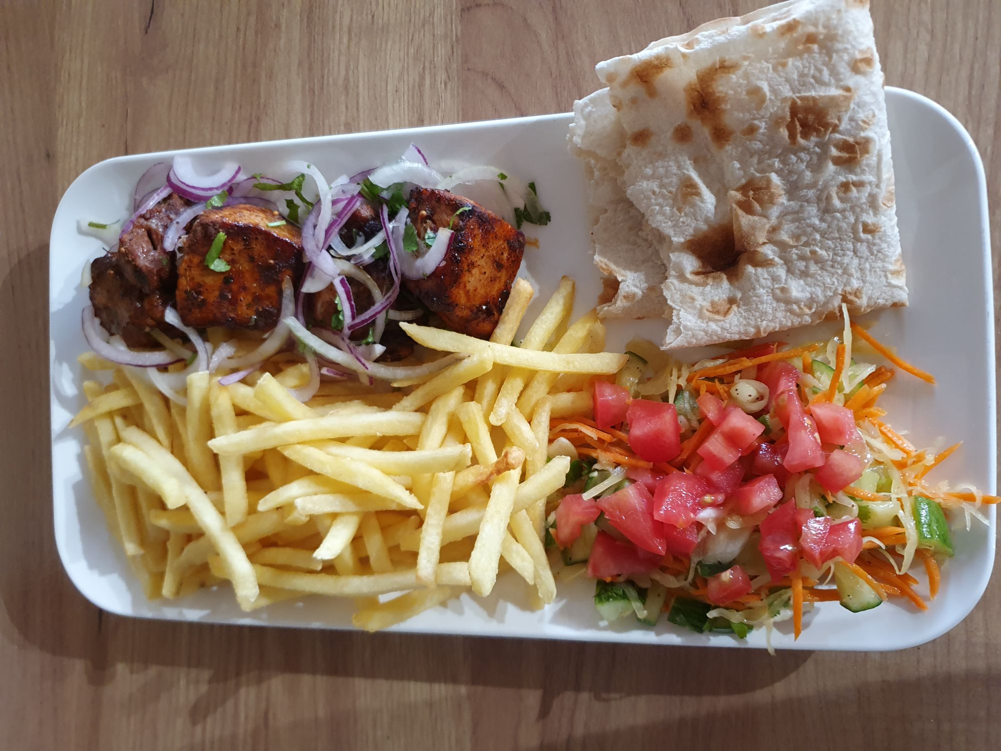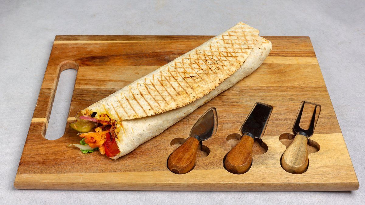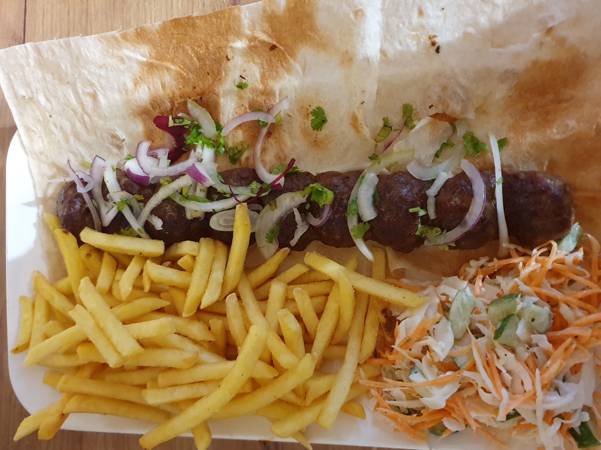 Danie jest podawane z mięsa mielonego i przyprawione w zestawie z frytkami lub grillowanymi ziemniakami, surówką, Lawaszem