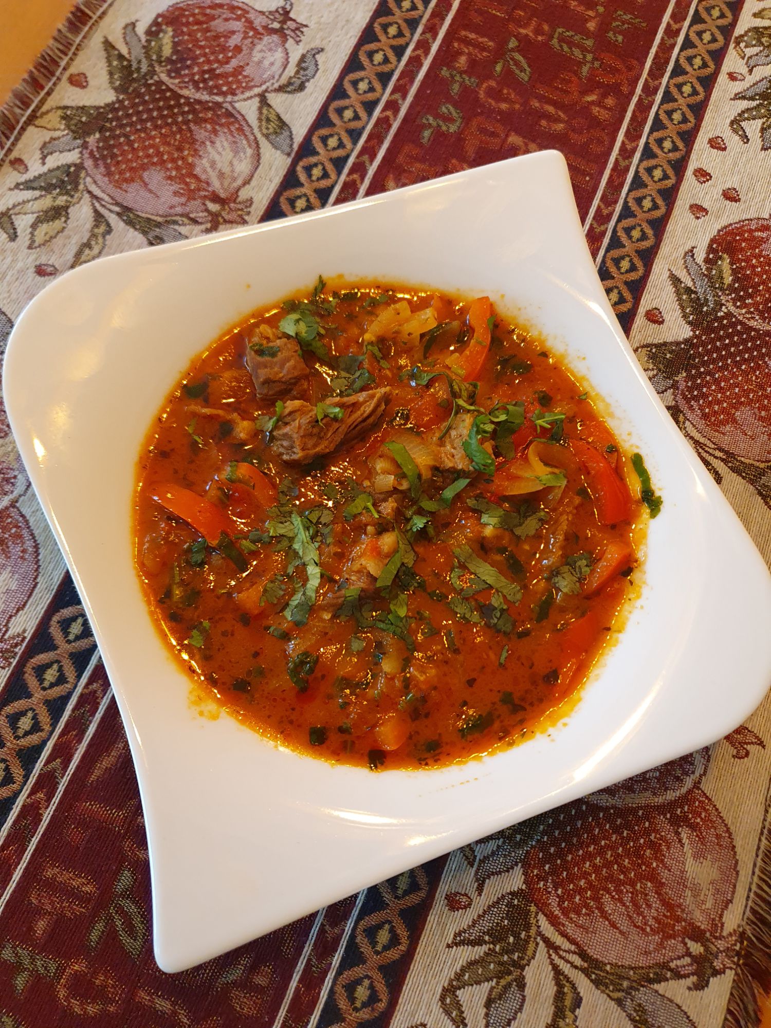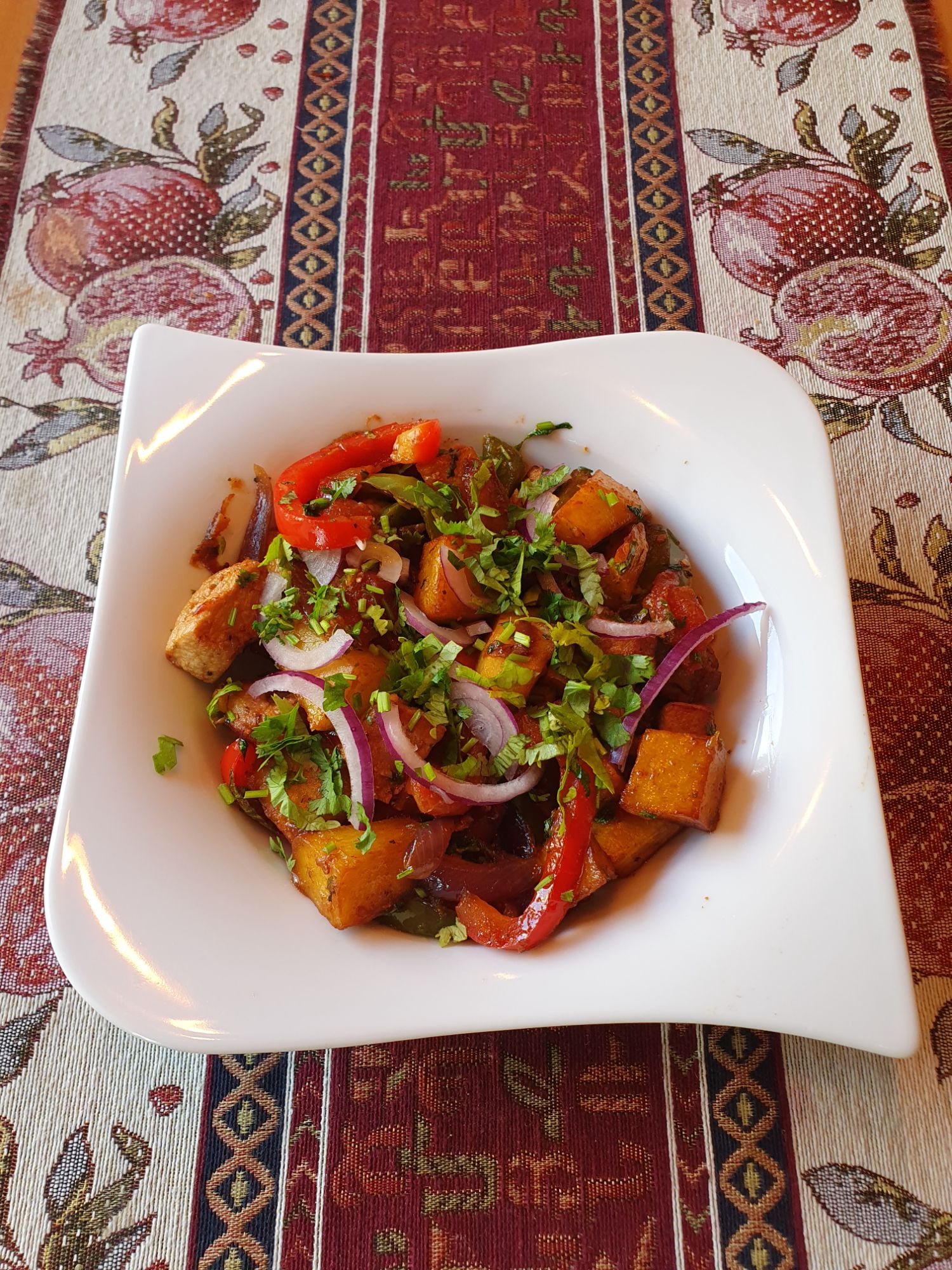 składniki: pieczarki, ziemniaki, papryka, pomidor, cebula, czosnek, kolendra
