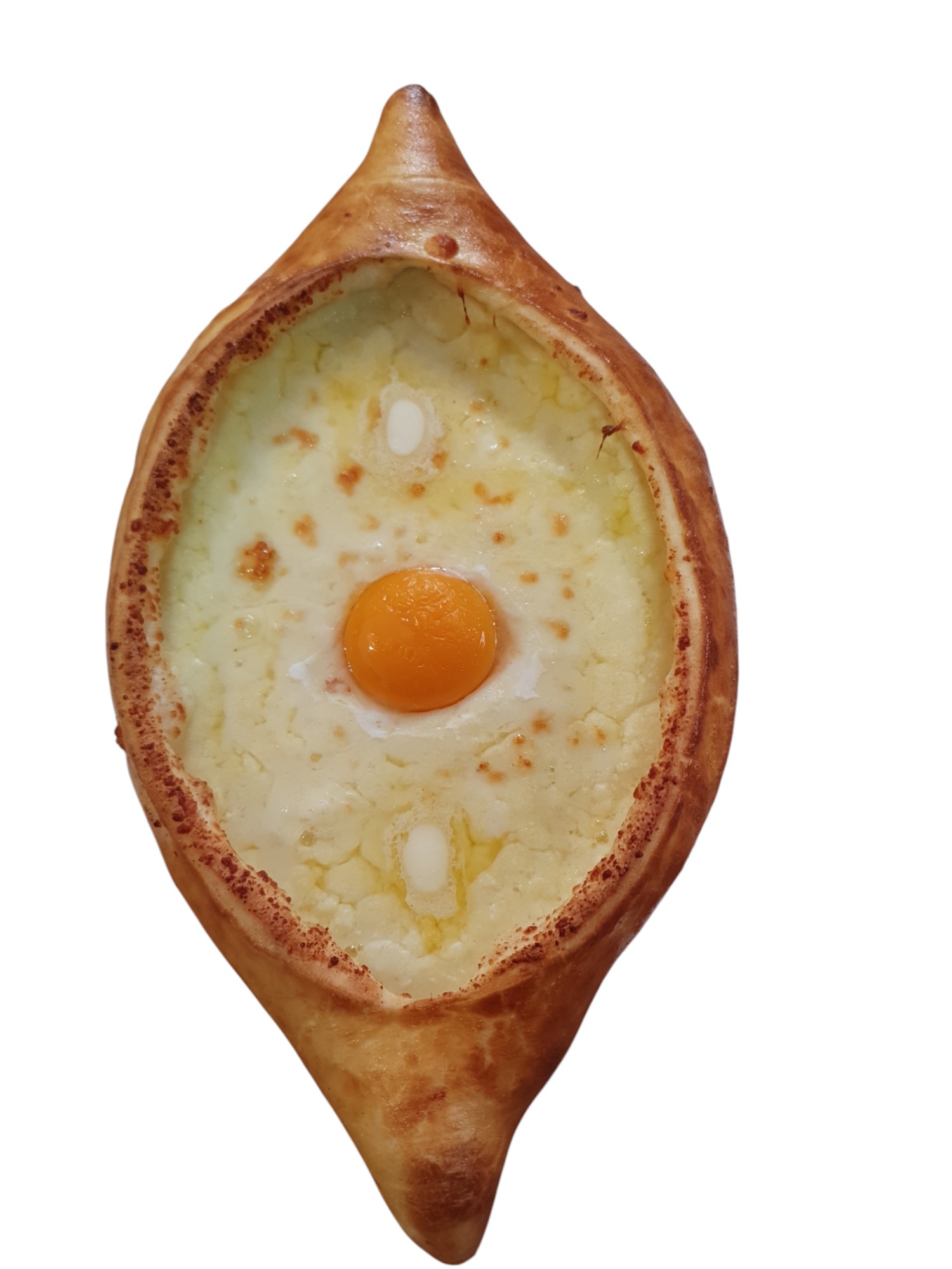 tradycyjne gruzińskie danie w kształcie łódki z drożdżowego ciasta, wypełnione po brzegi roztopionym, ciągnącym się serem, z surowym żółtkiem i kawałkiem masła dodawanym na gorąco przed podaniem; wnętrze to połączenie chrupiącego ciasta, idealne do odrywania i maczania w rozpuszczającym się serowo-jajecznym farszu